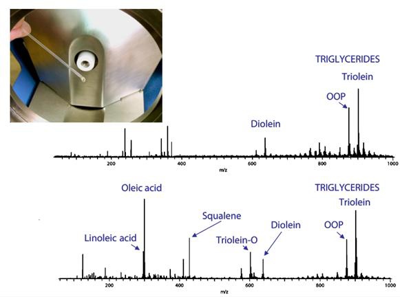 挑選烹飪油時,為了健康著想,通常我們會選擇有高不飽和脂肪酸的油(如:油菜、紅花或橄欖油等)。除了不飽和脂肪酸,油品中還會含有:油酸、亞油酸、角鯊烯(SQUALENE)和雙、三酸甘油酯等長碳鏈化合物,通常都會使用液相層析質譜儀(LC/MS)分析,但必須經過樣品前處理和長時間的分離。為了省去以上的麻煩,可以改用大氣游離法中的DART (Direct Analysis in Real Time) 質譜技術,直接對樣品進行質譜分析。如圖一所示,直接用玻璃棒沾取樣品油至於進樣口前分析(左上角)。如果使用傳統方式(正己烷稀釋,萃取進樣),相較於DART分析就會失去油酸(Oleic acid)、亞油酸(Linoleic acid)和角鯊烯等圖譜。