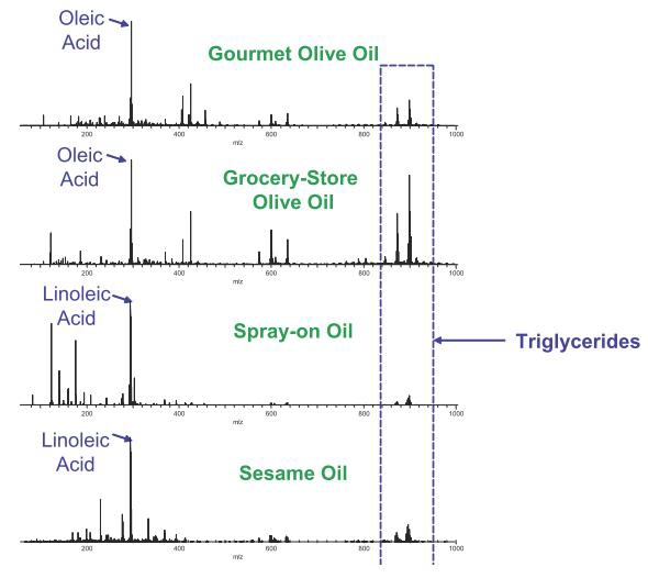 對於橄欖油,我們可針對不同來源(純度不同)橄欖油商品中所含的必需脂肪酸或是三酸甘油脂的成分與含量作分析與半定量方式,比較出油品的純度和來源和種類(圖二)。圖二中有四種油品,Gourmet等級橄欖油、市面常見橄欖油、噴霧式油和芝麻油(由上至下)。使用DART直接分析油品,我們可以看到不同等級的油品(前三者)其三酸甘油脂比例明顯有所不同,另外同是用來做涼拌的健康油品芝麻油,主要是以亞油酸為主,另外三酸甘油脂的比例也不是很高。