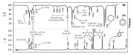 圖一、 甲苯光譜-IR(上)、Raman(下) |